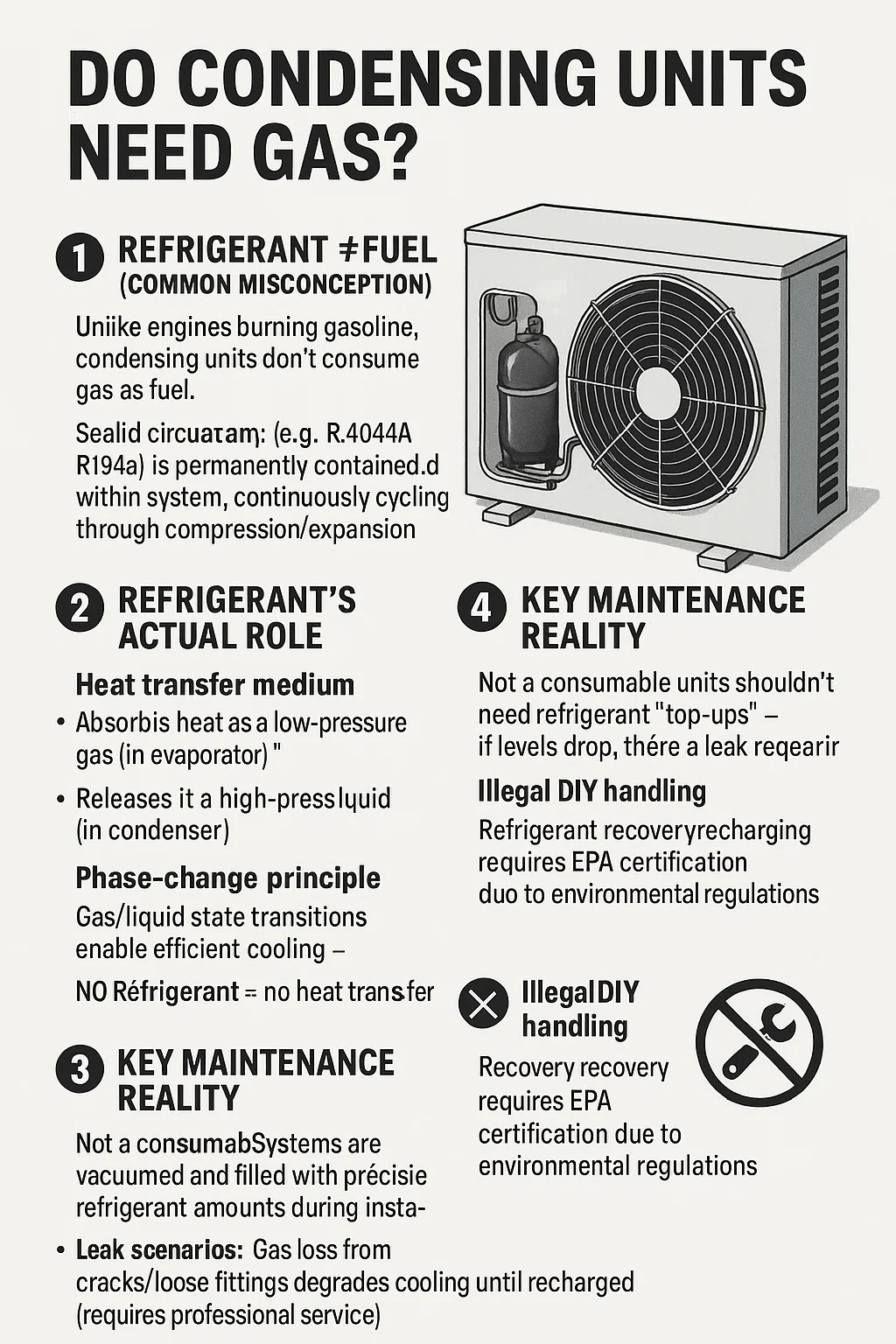 Nie, kondenzačné jednotky Samy „nepotrebujú plyn“ - ale ich chladiaci obvod absolútne vyžaduje fungovanie plynu chladiva. Tu je kritické zrútenie: