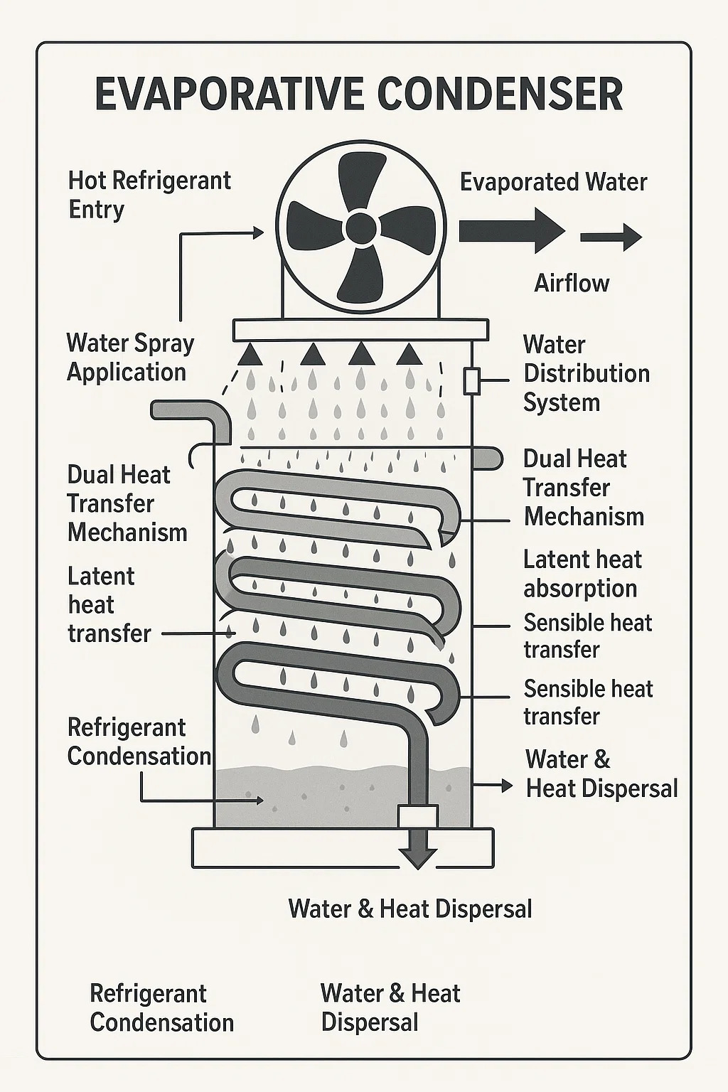 Citlivý prenos tepla: Prúdenie vzduchu odvádza zvyškové teplo z chladiva a neodparenej vody.