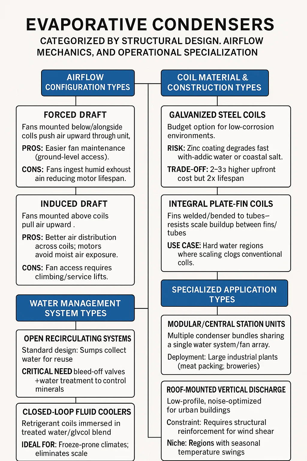 Odparovacie kondenzátory sú kategorizované podľa konštrukčného návrhu, mechaniky prúdenia vzduchu a prevádzkovej špecializácie. Nižšie je uvedený prehľad bežných typov zameraných na pole: