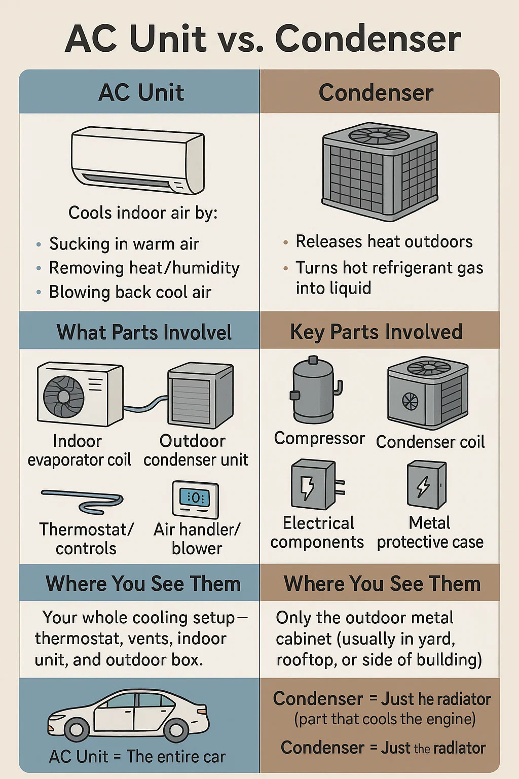 Kondenzátor: Len jedna časť AC jednotky – konkrétne vonkajšia kovová skrinka, ktorá uvoľňuje teplo.